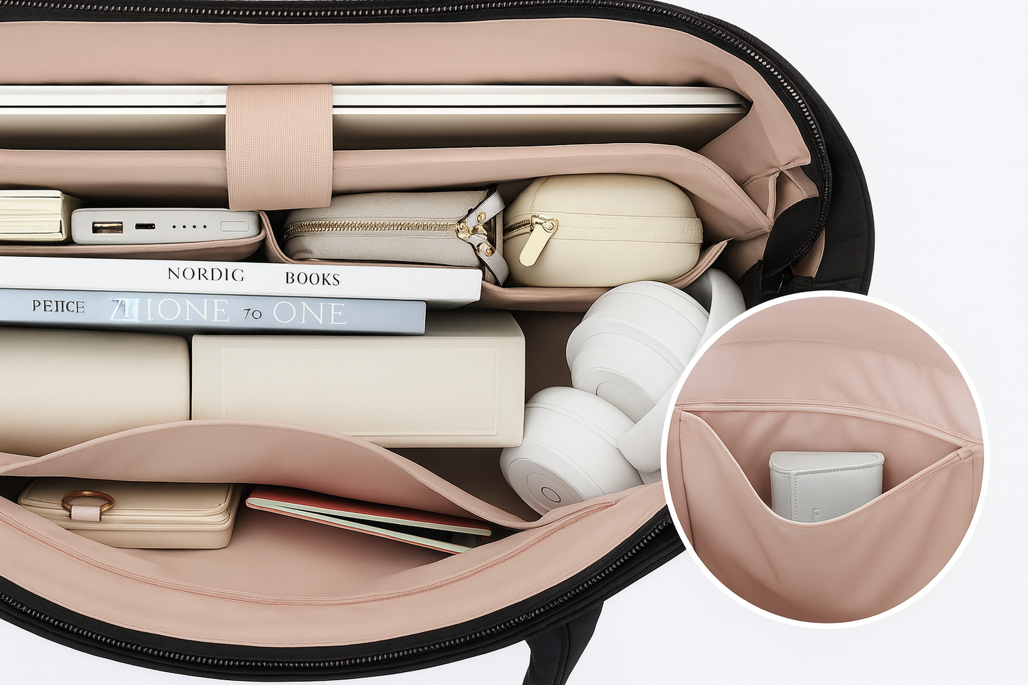 • Multiple inner pockets for tech, cosmetics, notebooks and accessories